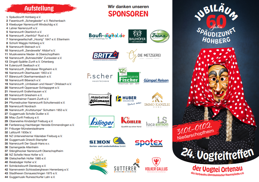 Der Jubiläumssonntag, 01.02.2026, beginnt um 10:45 Uhr mit einer Narrenmesse in der St. Brigitta-Kirche in Niederschopfheim. Im Anschluss ist das Narrendorf eröffnet. Das Highlight ist unser Jubiläumsumzug, welcher um 13:33 Uhr startet. Hier feiern wir nicht nur unser Jubiläum, sondern auch das 24. Vogteitreffen der Vogtei Ortenau des Verbandes Oberrheinischer Narrenzünfte. Für den Jubiläumsumzug wird ein Eintrittsgeld in Höhe von 5€ pro Person erhoben.